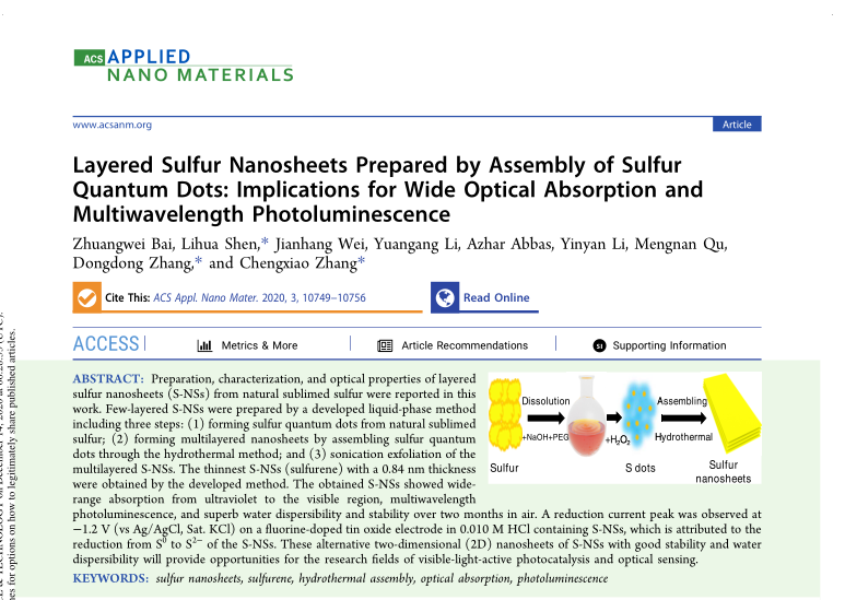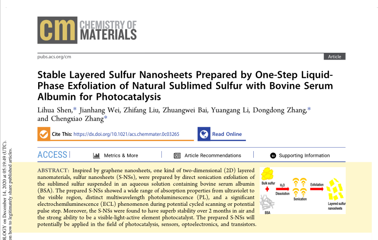 近日,公司研究生白状伟和魏建航在导师申丽华的指导下,在硫纳米材料领域取得重要进展,相继在美国化学会旗下期刊ACS Applied Nano Materials和SCI一区top期刊 Chemistry of Materials (影响因子9.56)上报道了新型二维层状硫纳米材料的合成及其光电催化特性。