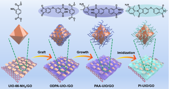 为了解决上述问题,我院杨志远教授团队在前期研究基础上,通过原位化学编织和缩合亲核反应巧妙设计了一种新型的多孔超交联聚亚酰胺-UiO-石墨烯复合吸附材料用于捕获二氧化碳。具体而言,通过4,4′-氧化二苯二甲酸酐和2,4,6-三甲基-1,3-苯二胺的反应,合成了一种具有氨基末端的富含羰基和氮原子的聚亚酰胺网络,该聚合物在分离二氧化碳和氮气中起着关键作用(图1)。所得复合材料(PI-UiO/GO-1)的CO2容量是原UiO-66-NH2的3倍(298 K和30 bar时为8.24 vs 2.8 mmol·g-1),CO2/N2选择性是原UiO-66-NH2的4.2倍(64.71 vs 15.43),并且显著提高了耐酸碱稳定性。此外,穿透实验证明,该多孔复合材料能有效地从模拟燃料气(CO2/N2=15/85 vol%)中分离CO2,具有很大的工业应用潜力。更重要的是,该方法可以推广到其它MOFs基复合材料的制备,促进了用于气体捕集的MOF-聚合物材料的发展。