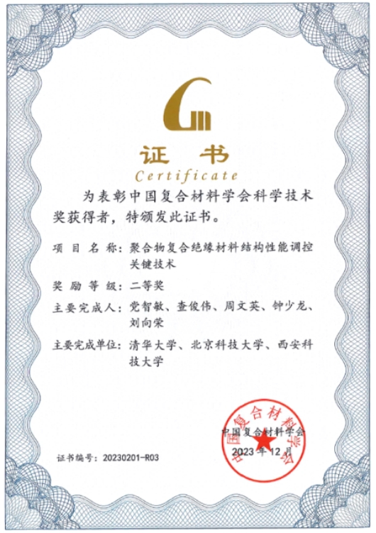 近日,中国复合材料学会根据《中国复合材料学会科学技术奖励办法》和《中国复合材料学会科学技术奖励办法实施细则》,公布了2023年度的科学技术奖最终获奖名单,PA视讯平台PA视讯周文英教授及刘向荣教授和清华大学清华大学电机与微电子系党智敏教授团队联合申报的“聚合物复合绝缘材料结构性能调控关键技术”项目荣获中国复合材料材料学会二等奖,PA视讯周文英教授及刘向荣教授分布为第三及第五项目完成人。此次全国范围仅10项成果获奖,其中一等奖2名,二等奖8名。