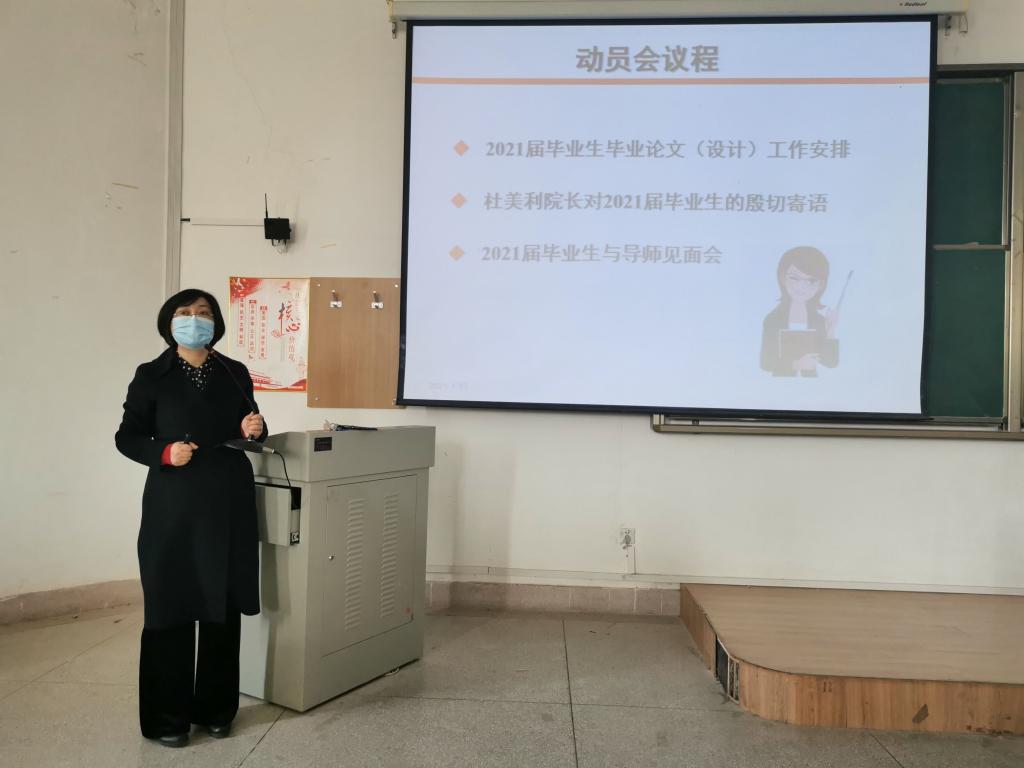1月13日下午,公司在临潼校区9-105教室召开了2021届本科毕业论文(设计)动员大会。PA视讯全体教师与2021届本科毕业生参加了动员大会,按照疫情要求全体师生佩戴口罩、隔位就座。教学经理张亚婷就毕业论文工作题目征集、师生双选、指导教师队伍、员工纪律几个方面做了整体情况的介绍,重点对毕业论文的系统管理、论文查重抽检、教育部下达的论文抽检工作进行了特别要求,对于疫情期间员工毕业论文(设计)的实验室安全管理提出严格要求。希望各位老师和同学按照系统时间截点,完成论文的各个环节,同时踏实认真做实验,诚实写论文,杜美利经理做了总结性的发言,希望大家克服疫情带来的影响,遵守学术诚信与道德,以最真实、最热情、最饱满的状态做好大学四年最后的、也是关键的教学环节,为自己未来的发展奠定坚实的科学实践基础。