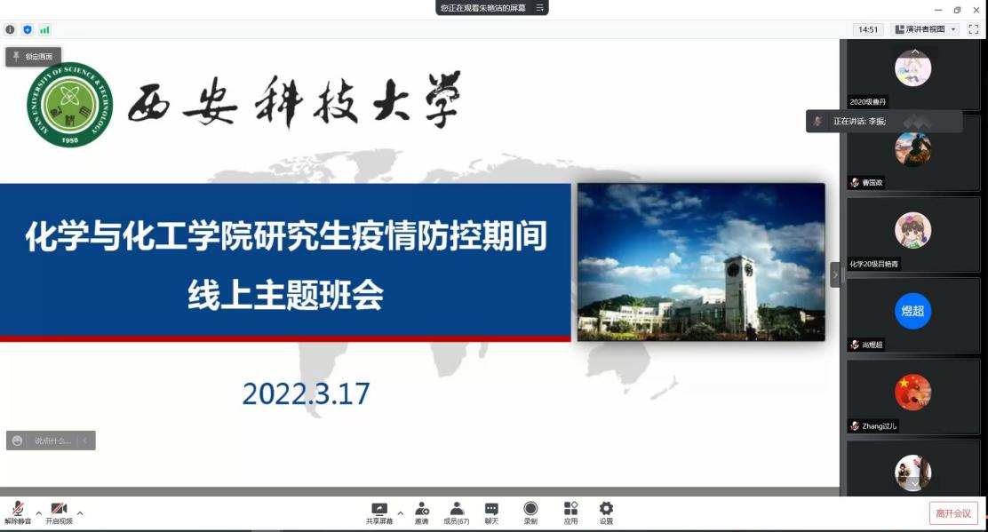 3月17日晚,PA视讯按照研究生不同年级的学业阶段特点,分别召开了以疫情防控和学业科研规划为主题的线上班会。特别邀请邓军副董事长参加,班会由李振副经理主持,经理张亚婷、党委副书记杨宝华、研究生辅导员及全体研究生参加了会议。
