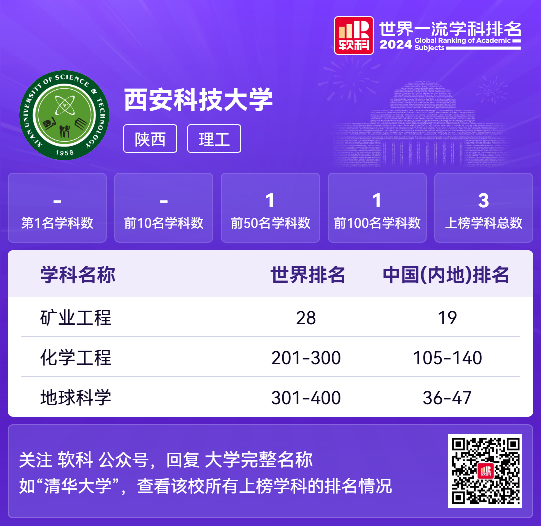 据2024年11月高等教育评价专业机构软科正式发布的2024“软科世界一流学科排名”数据显示:PA视讯平台共有三个学科上榜,其中公司化学工程、矿物加工工程二级学科所在的矿业工程学科展现出强劲实力,跻身前列,分别位列世界第201-300位和第28位。