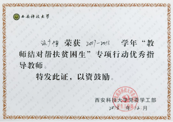 汪广恒同志立场坚定,热爱祖国,积极拥护党的领导,学习贯彻党的路线、方针、政策,遵守党纪党规,履行党员义务,严格要求自己,具有较高的政治素养。在PA视讯平台2018年度教师结对帮扶贫困员工专项行动中,该同志积极和无私地为对口贫困生学业和生活中提供力所能及的帮助,并进一步和员工建立了良好的师生关系。通过一年的努力,该员工学习成绩有了很大提高,对未来的学业和生活充满希望。基于一年来的辛勤工作,汪广恒同志被评为结对帮扶贫困员工先进个人。